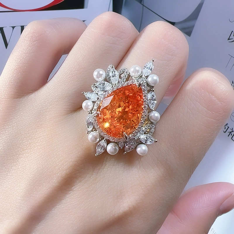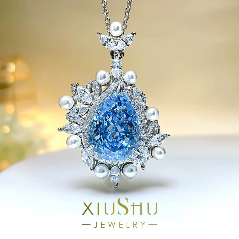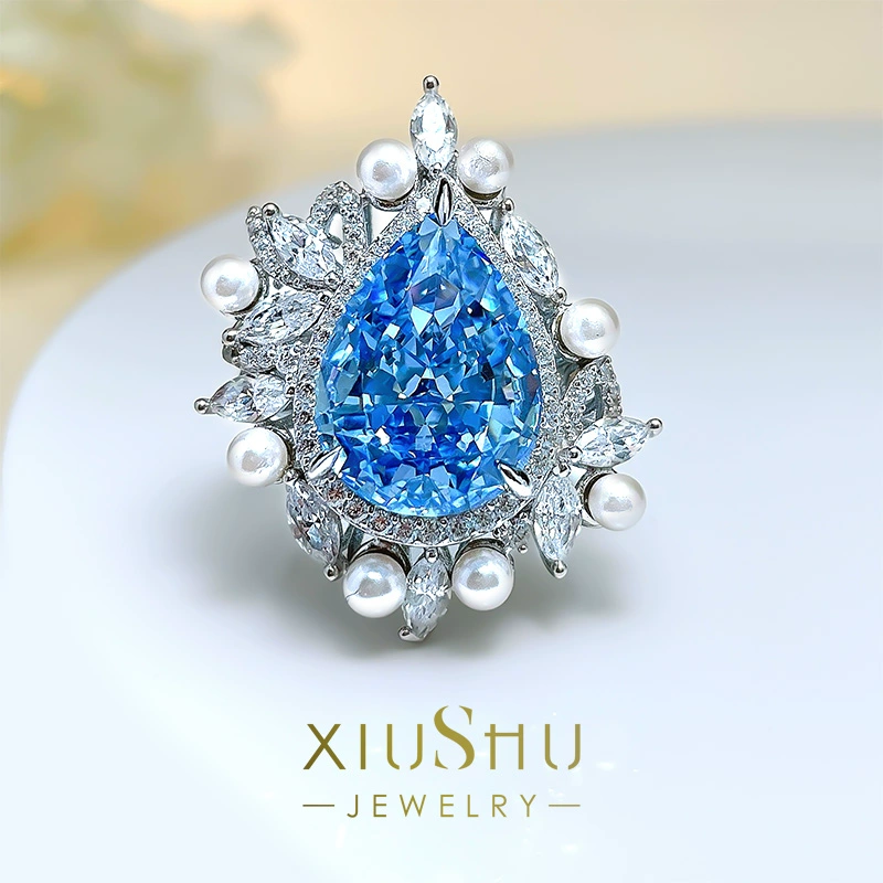 | nameOriginal | Retro mother-of-fritillary pearl aquamarine ring for women niche design light luxury palace high carbon diamond 925 silver water drop pear shape |
