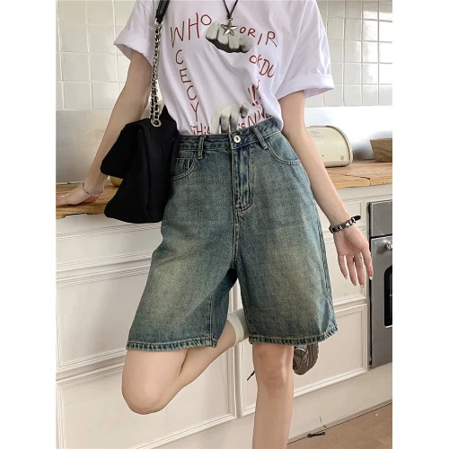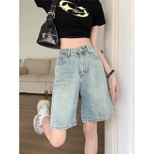 | nameOriginal | Retro nostalgic light blue denim five-quarter pants for women summer new high-waisted loose straight pants wide-leg shorts |