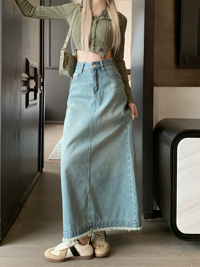 | nameOriginal | Retro nostalgic raw edge slit A-line denim skirt |