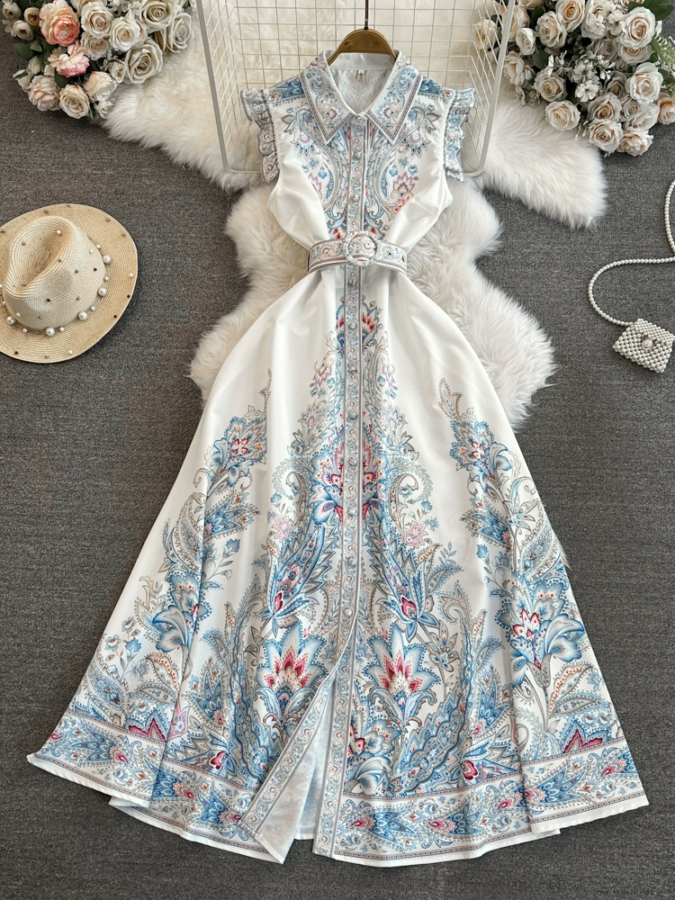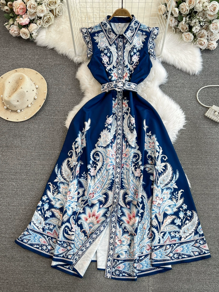 | nameOriginal | Retro palace style design flying sleeves lapel waist single breasted a line positioning printed dress dress for women |
