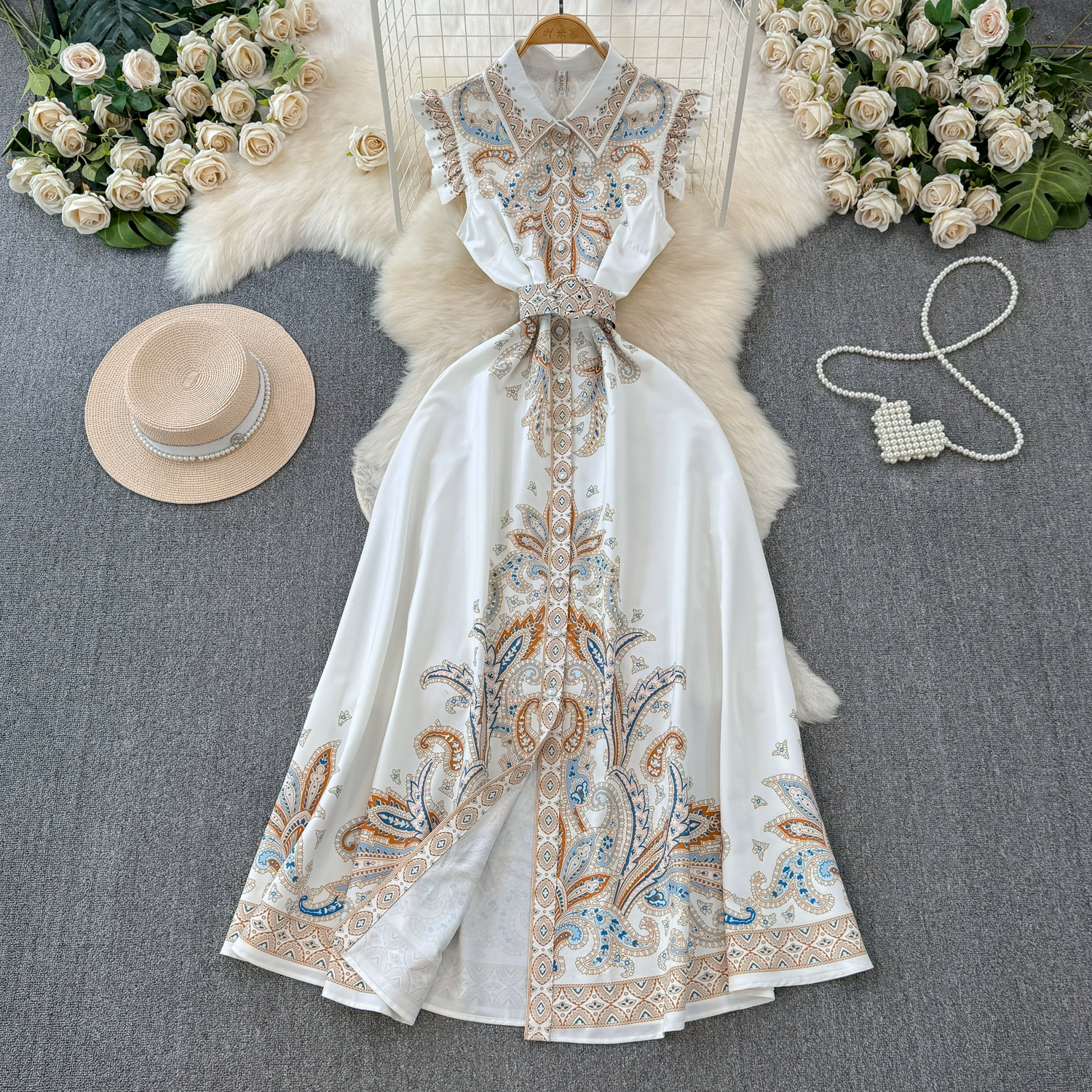 Retro palace style goddess model lady temperament single-breasted lapel printed dress elegant a-line long skirt