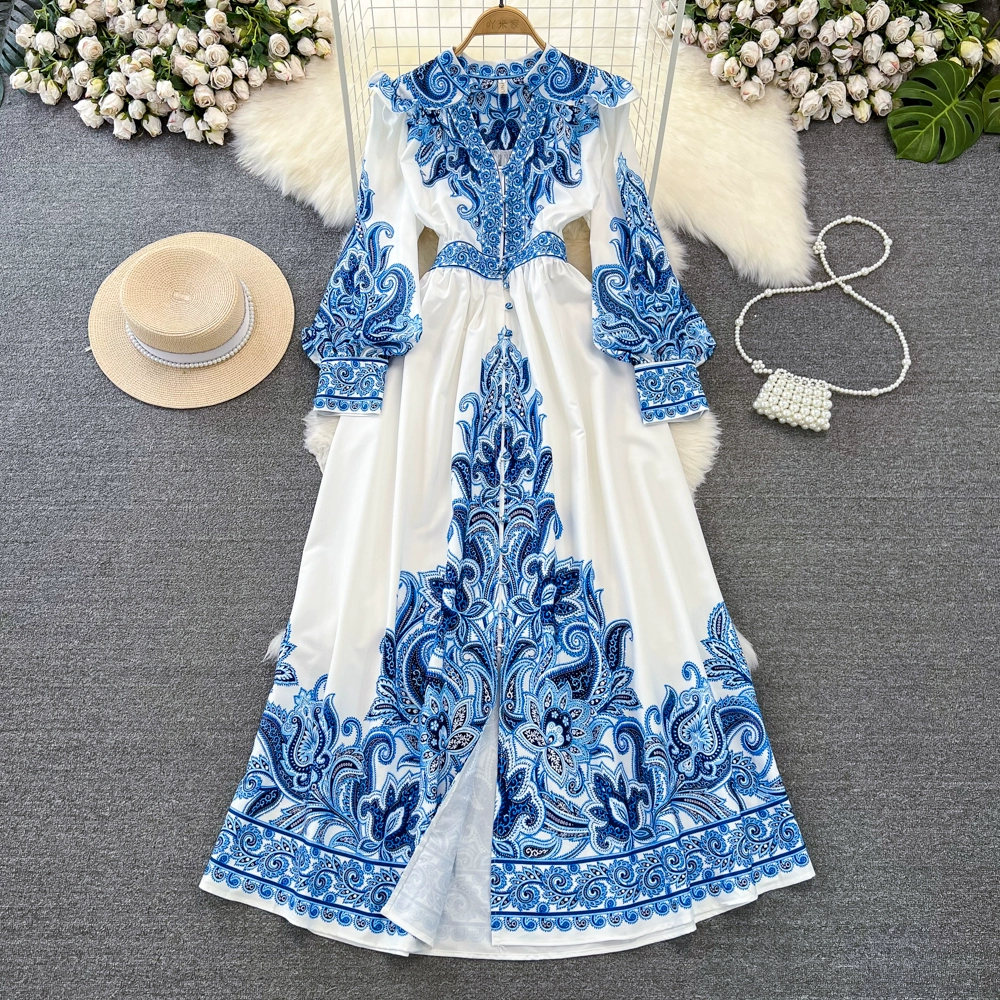 | nameOriginal | Retro palace-style lantern sleeves, stand-up collar, waisted A-line single-breasted celadon positioning print dress |