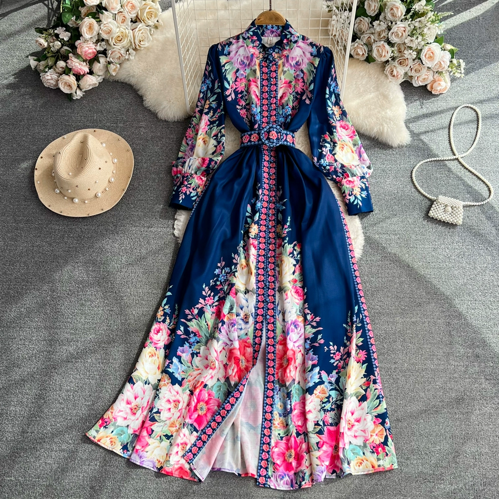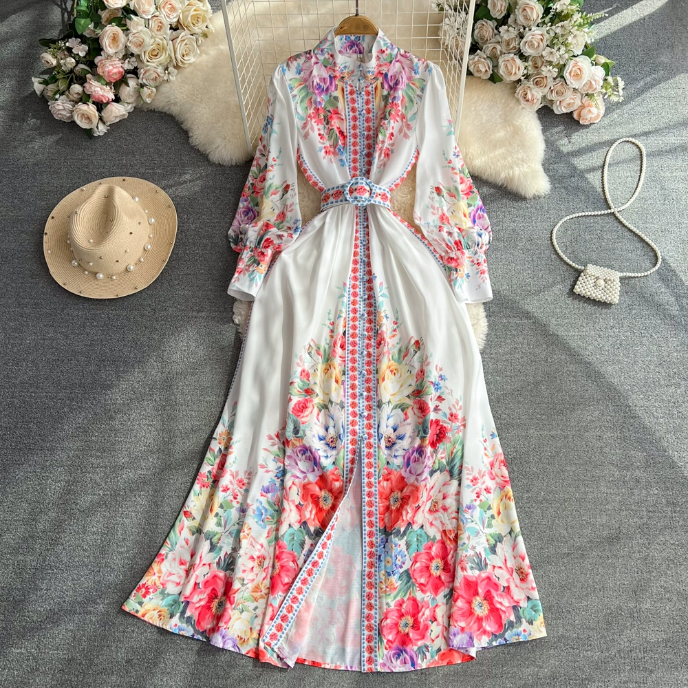 | nameOriginal | Retro palace style stand-up collar lantern sleeves waist slimming single-breasted a-line printed dress elegant dress long skirt |