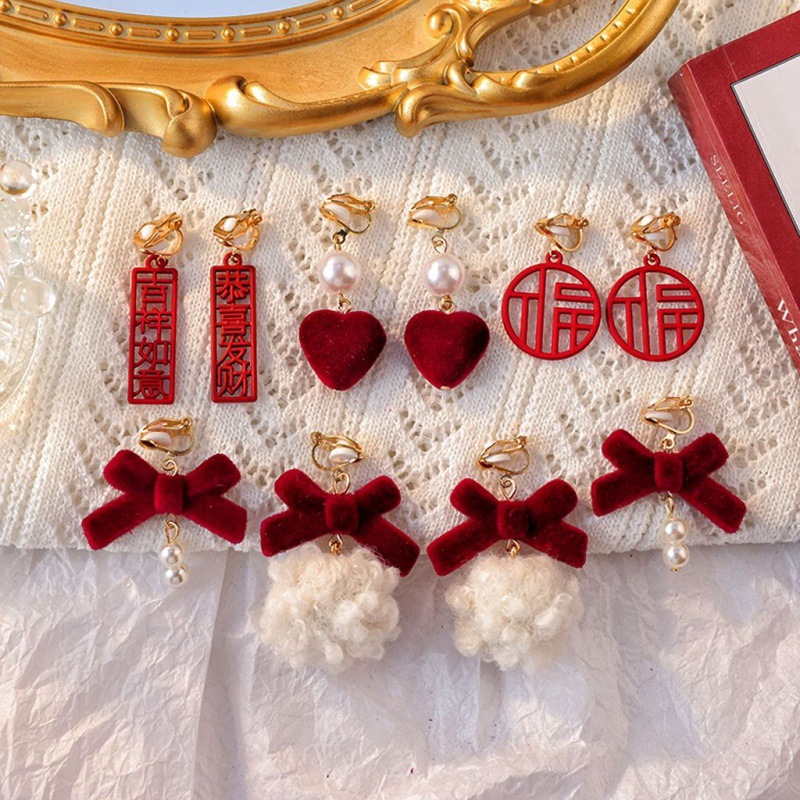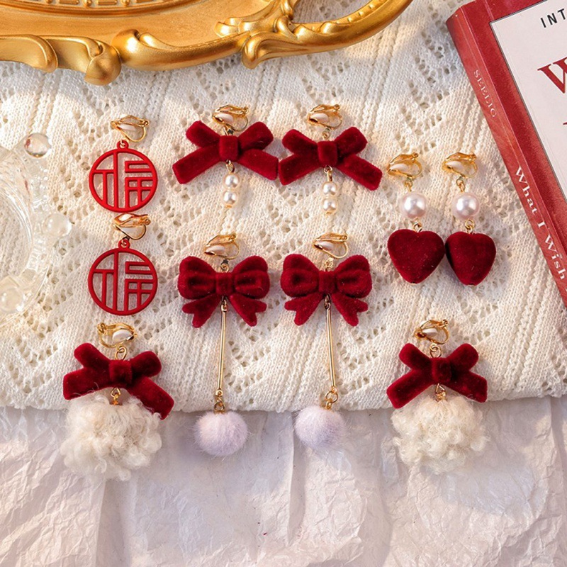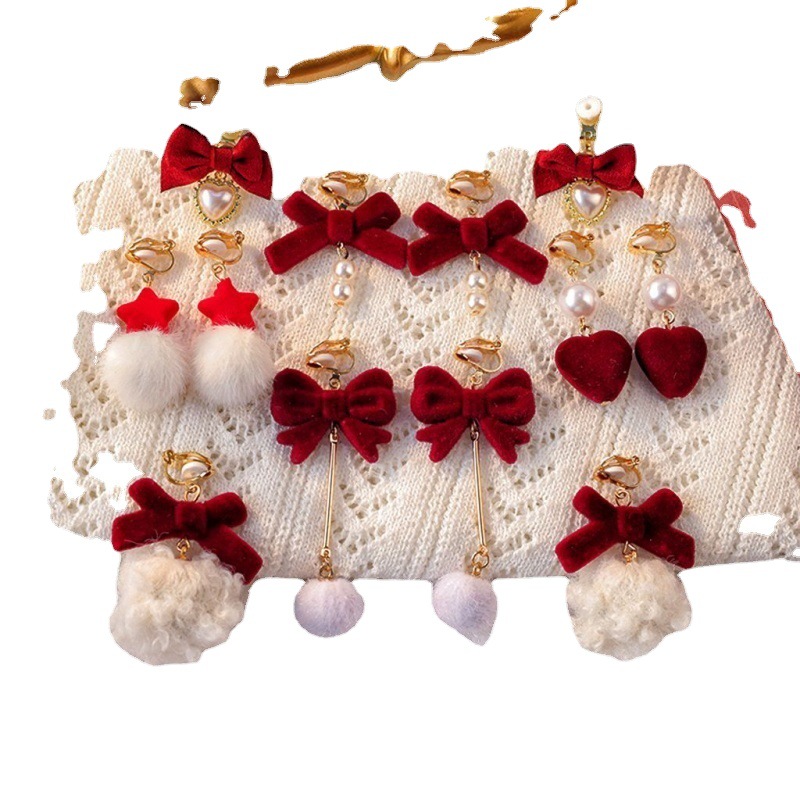 | nameOriginal | Retro Red earrings velvet bow pearl earrings elegant ear clip without pierced women's autumn and winter earrings |