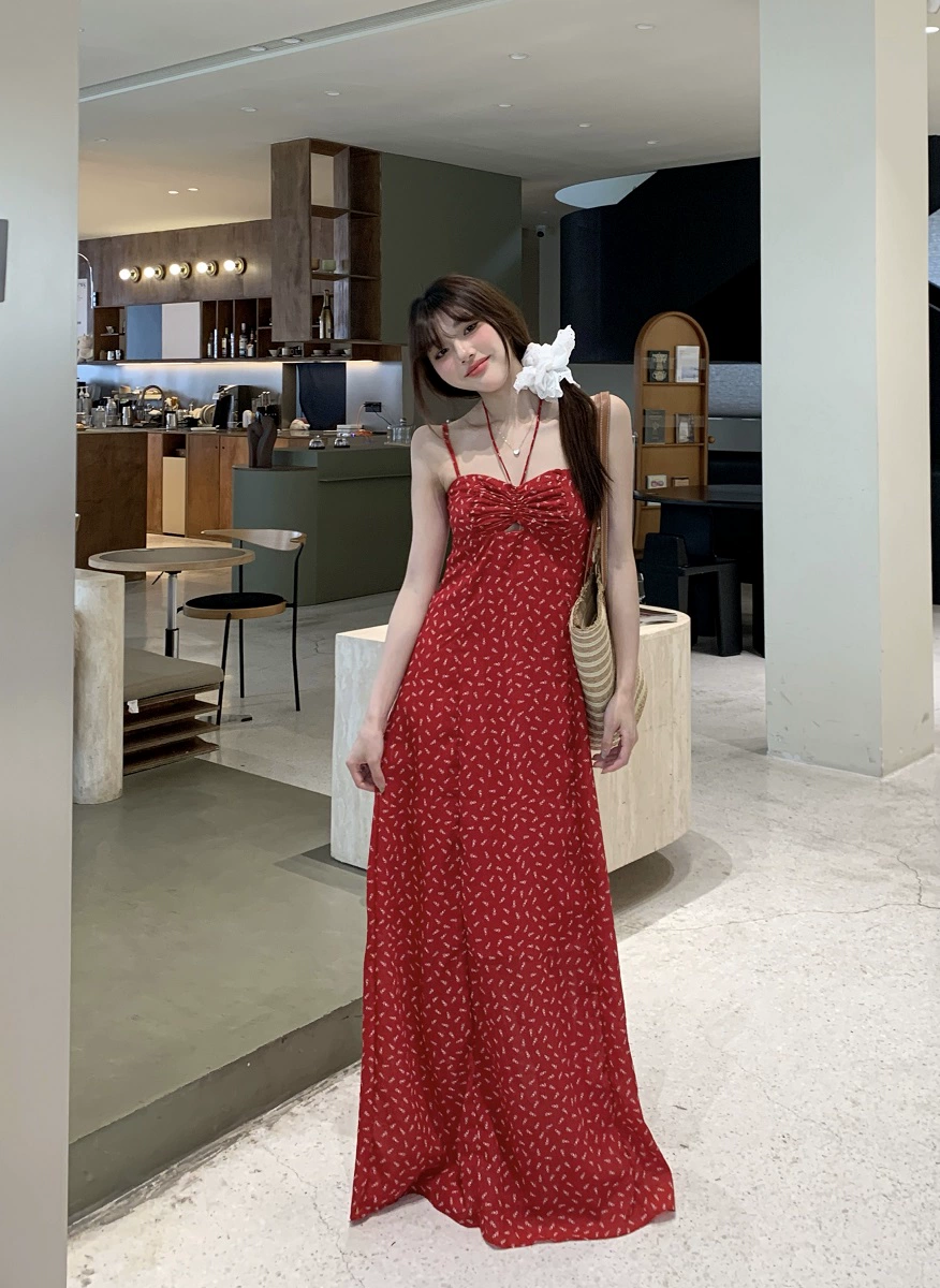 | nameOriginal | Retro red summer slim fit hollow A-line skirt with halter neck |