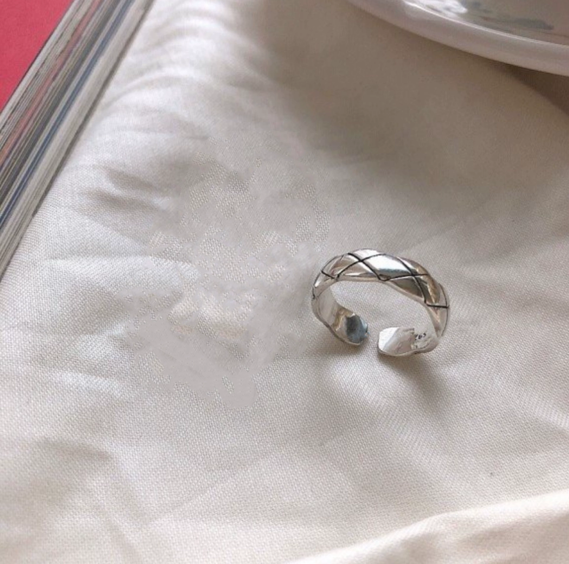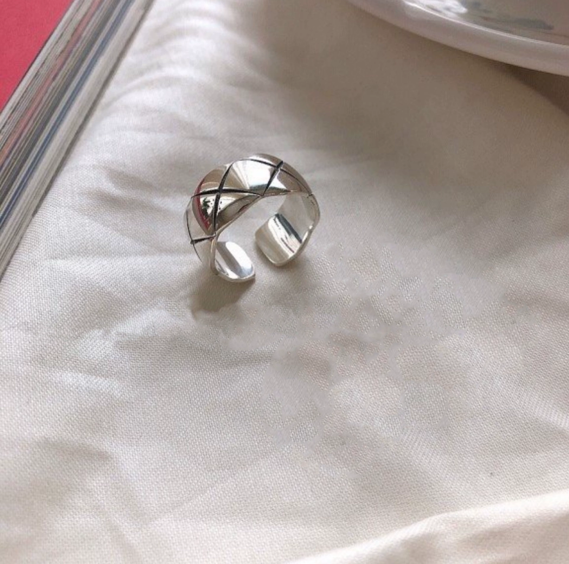 Retro rhombus wide version ring for women Korean style fashionable personality S925 silver grid open ring stacked index finger ring trendy