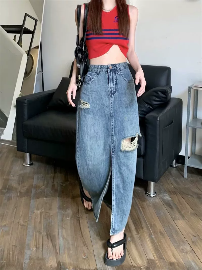 Retro ripped denim skirt for women in spring and autumn, high-waisted, slimming, plus-size design, niche hip-hugging A-line mid-length skirt