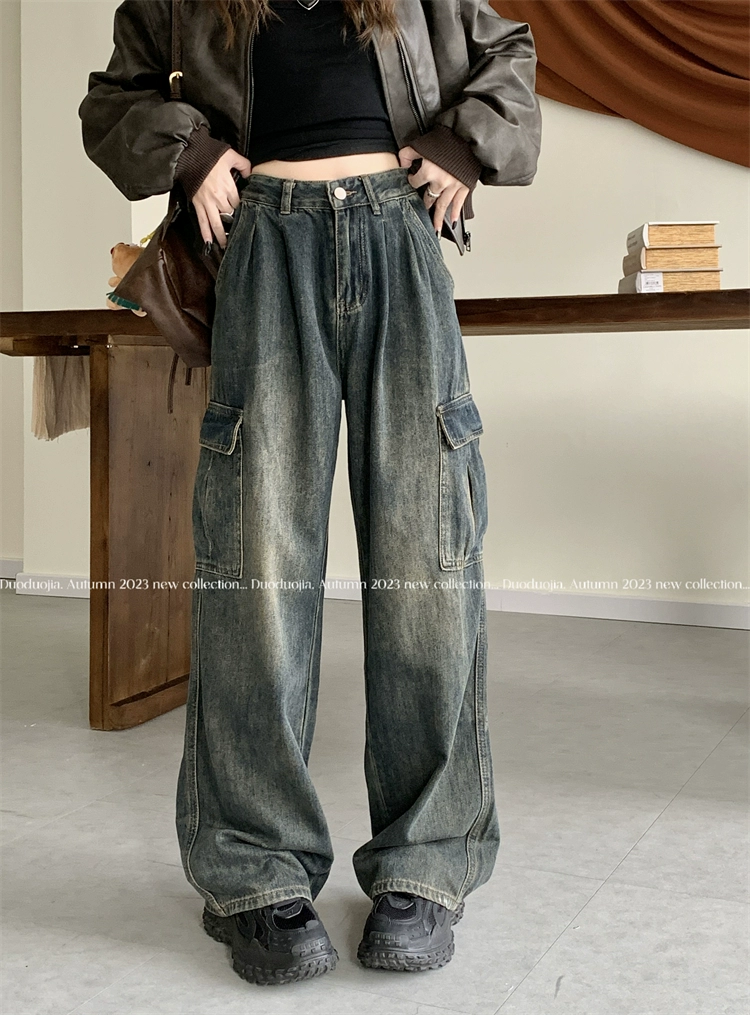 Retro spring high-waist design straight trousers overalls