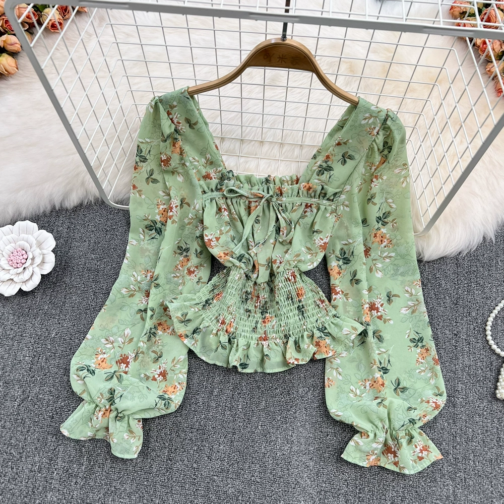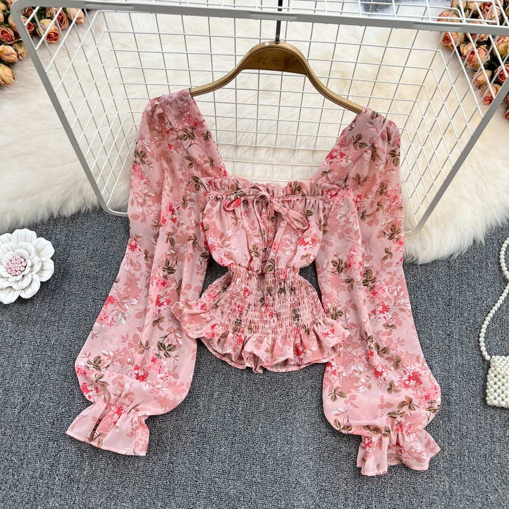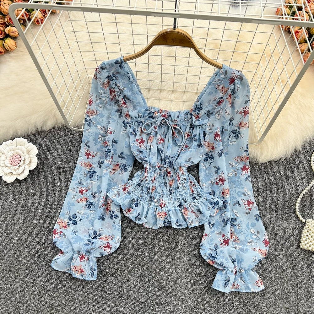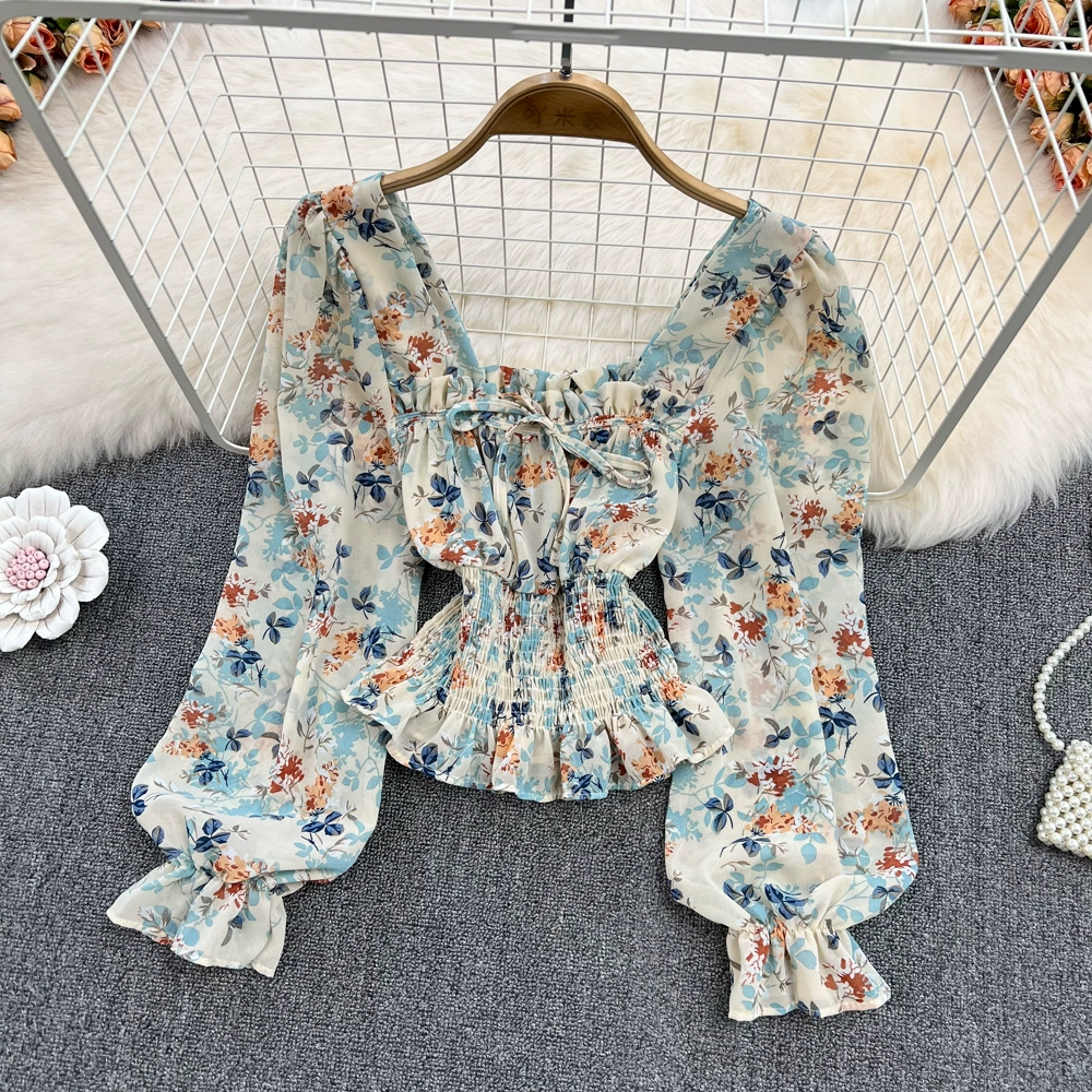 | nameOriginal | Retro square collar ruffled crop top chiffon shirt |