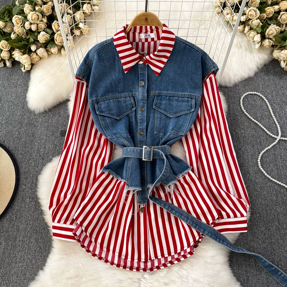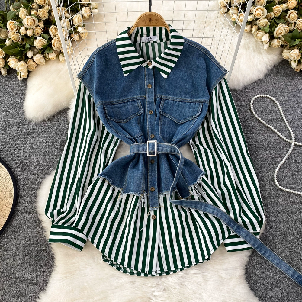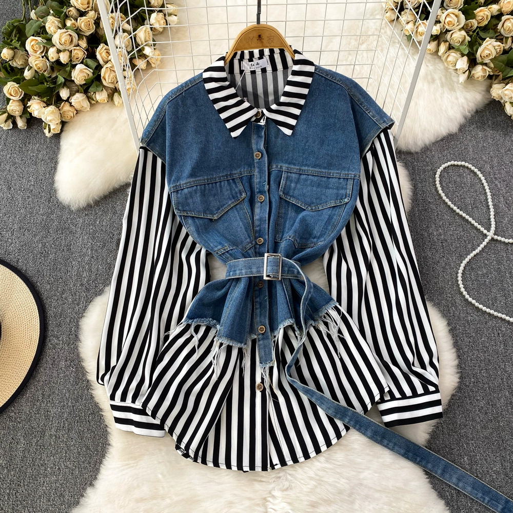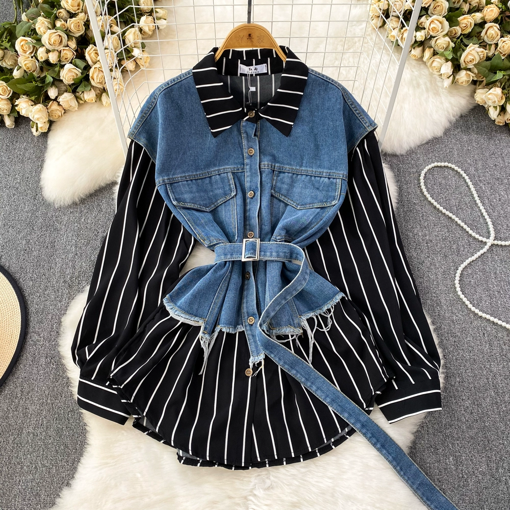 Retro style loose denim vest casual fake two pieces