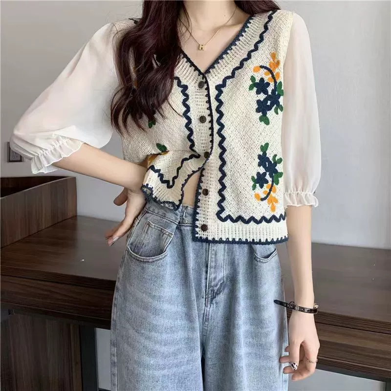 Retro thin V-neck cardigan with puff sleeves and hollow embroidery