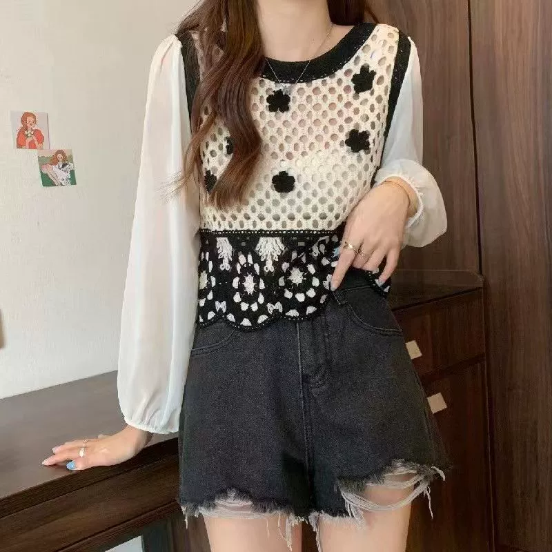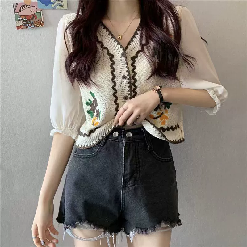 Retro chiffon V-neck cardigan puff sleeve hollow embroidery