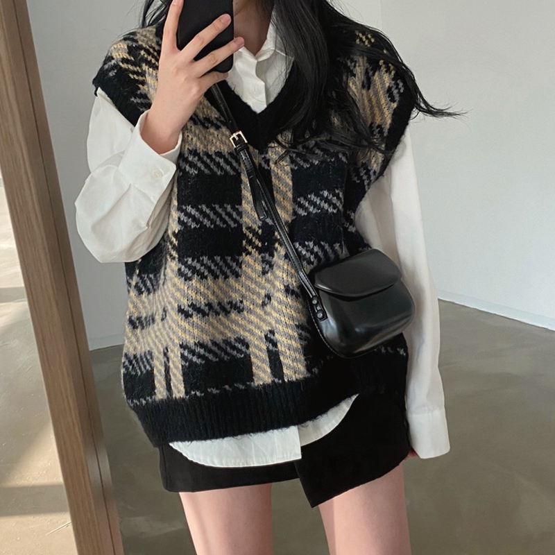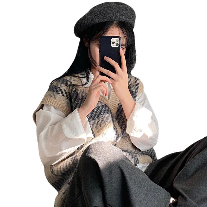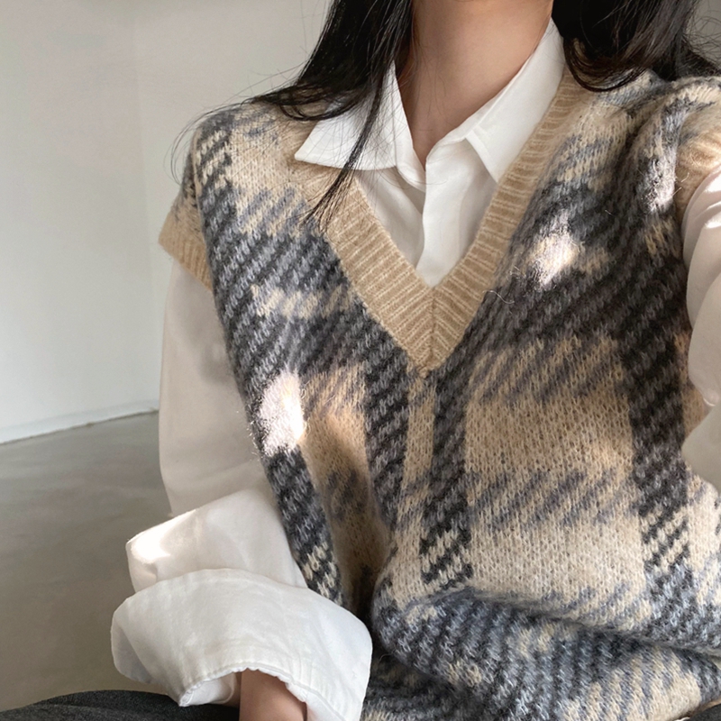 Retro V-neck Plaid knitted vest for women Winter Spring and Autumn loose outer wear overwear sweater vest 2023 New