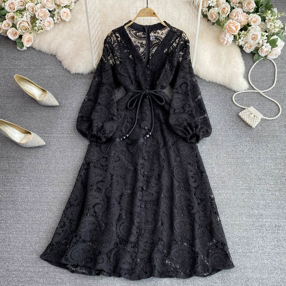 Retro V-neck water-soluble lace dress with elegant crochet
