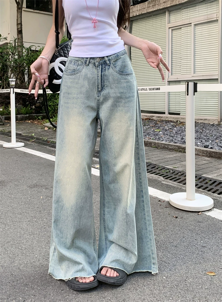 | nameOriginal | Retro washed blue raw edge straight high waisted wide leg pants |