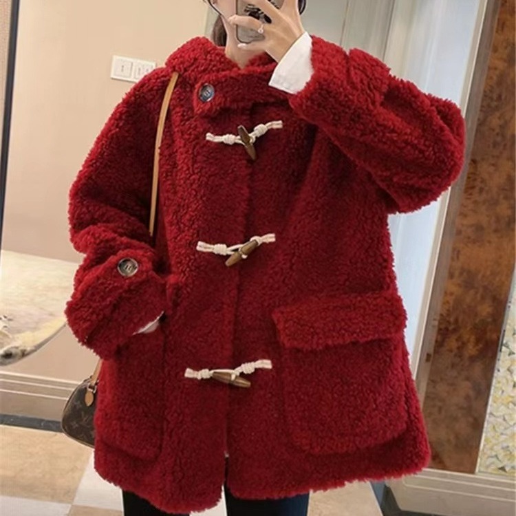Retro wine red lambswool horn buckle hooded coat women’s loose plus size atmosphere cardigan coat New Year red