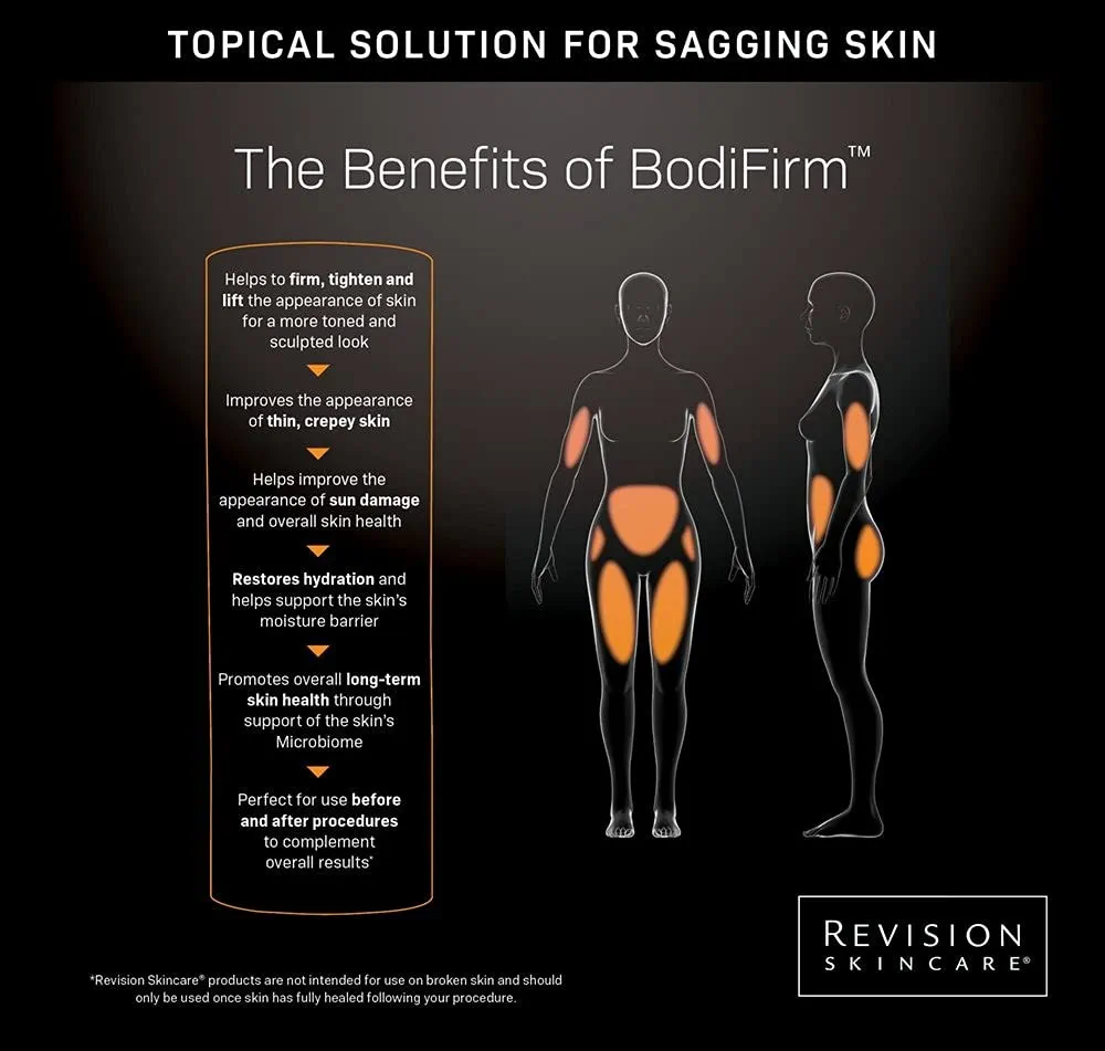Revision Skincare BodiFirm is a luxurious body lotion that helps to improve the appearance of sagging, aging skin. This advanced formula is designed to target the neck, chest, arms, and legs, providing a firmer, more toned look. With regular use, BodiFirm helps to smooth and tighten the skin, reducing the appearance of fine lines and wrinkles. The lightweight, non-greasy formula absorbs quickly, leaving skin feeling soft and supple. Infused with powerful antioxidants and hydrating ingredients, this body lotion helps to protect and nourish the skin, promoting a more youthful, radiant complexion. Ideal for all skin types, BodiFirm is the perfect addition to any anti-aging skincare routine.