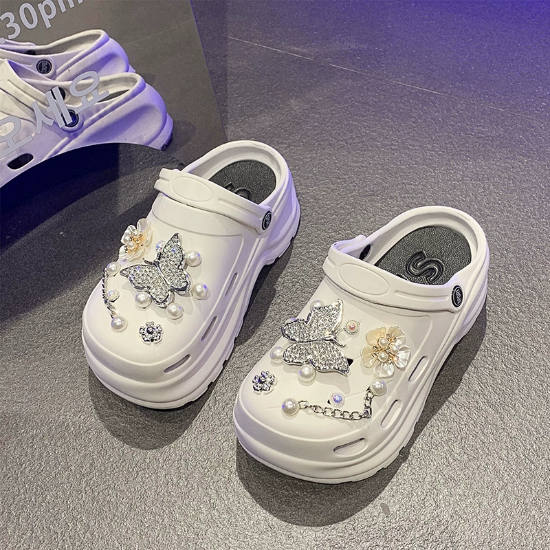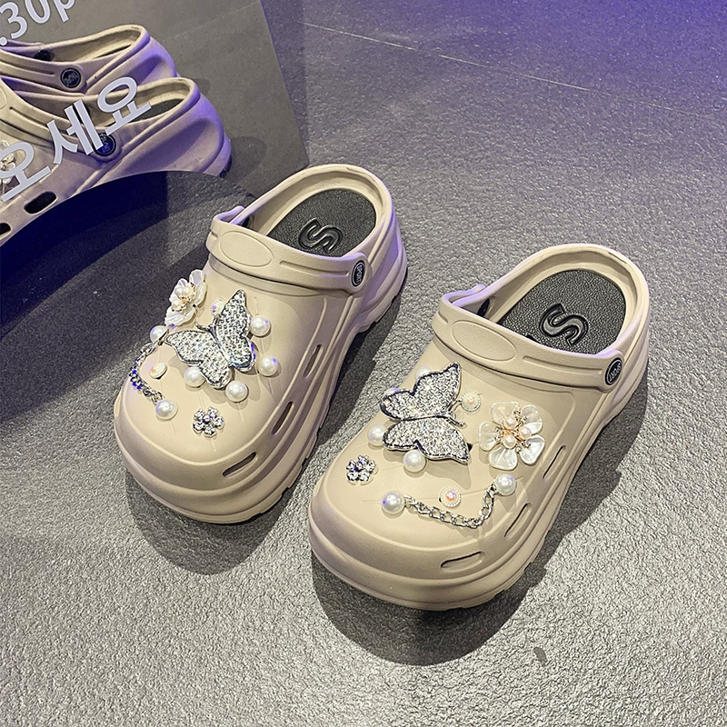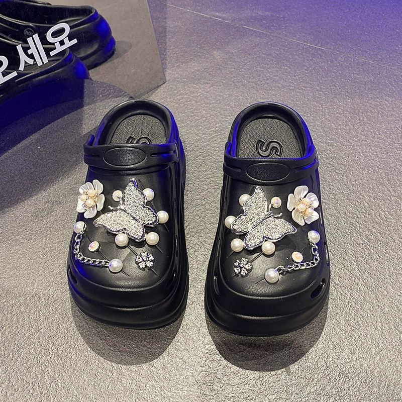 Rhinestone and pearl heightening fashionable outer toe clogs