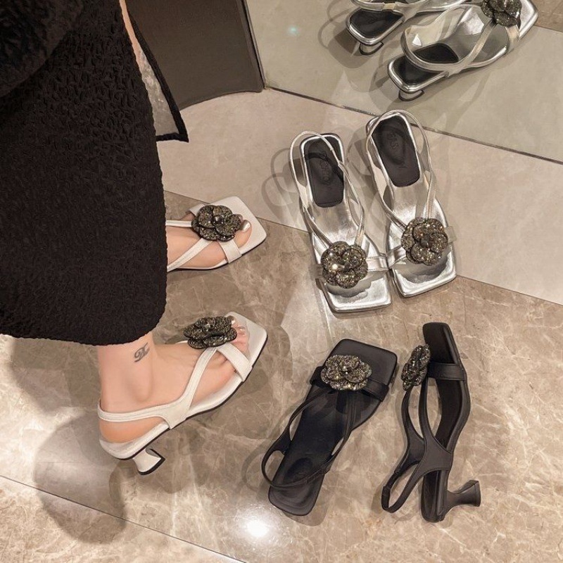 Rhinestone Camellia elastic band sandals open toe 2024 summer empty new high heels skirt super soft