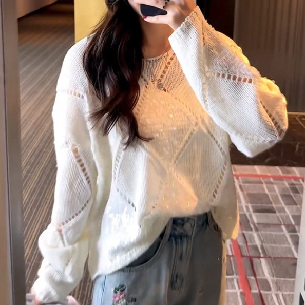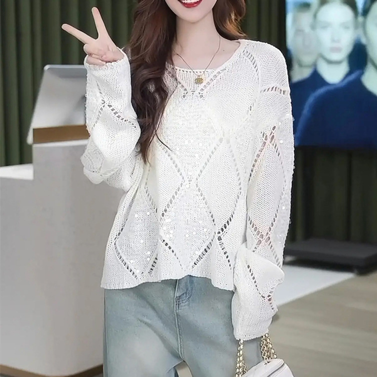 | nameOriginal | Rhombic Sequin Hollow Pullover Air-conditioning Blouse Women's 2024 Spring and Summer New Loose Lazy Style Knitted Top |