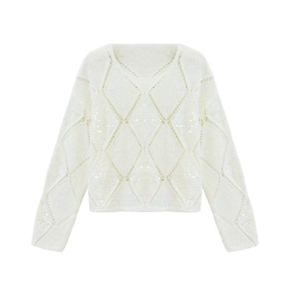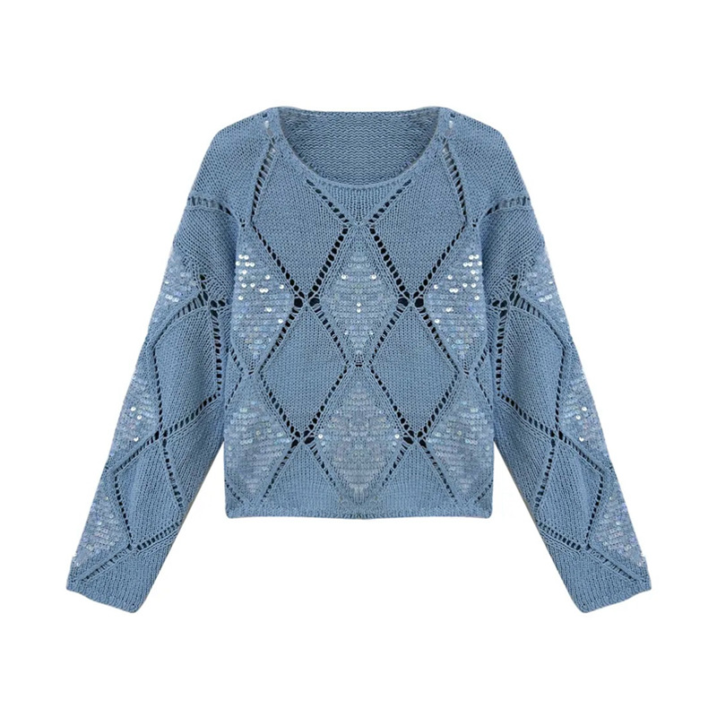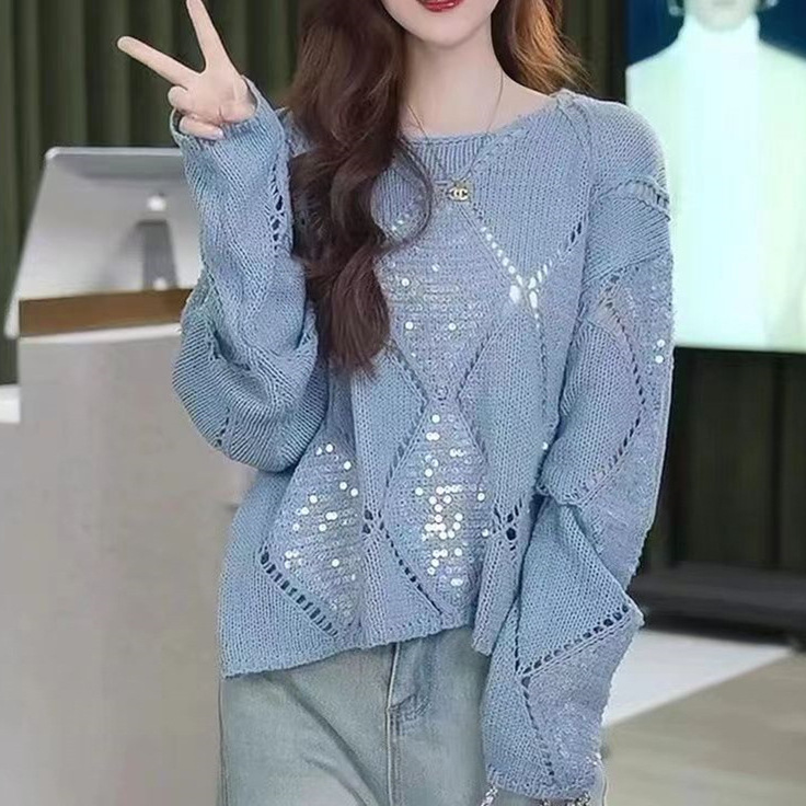 | nameOriginal | Rhombic Sequin Hollow Pullover Air-conditioning Blouse Women's 2024 Spring and Summer New Loose Lazy Style Knitted Top |
