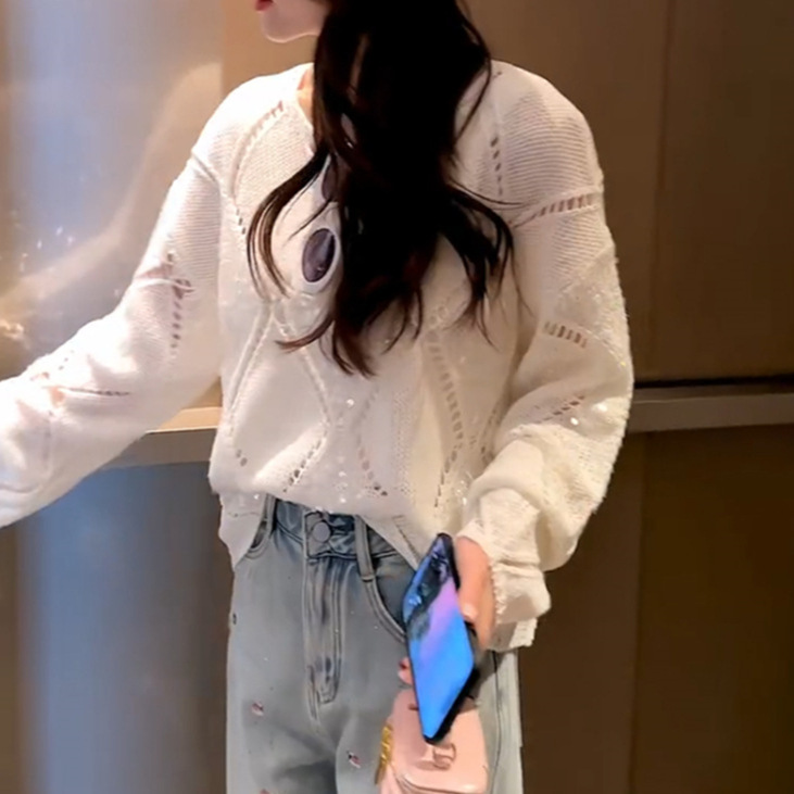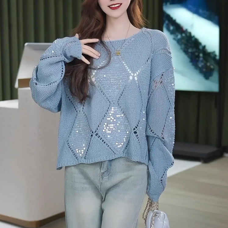 Rhombic Sequin Hollow Pullover Air-conditioning Blouse Women’s 2024 Summer New Loose Lazy Style Knitted Top