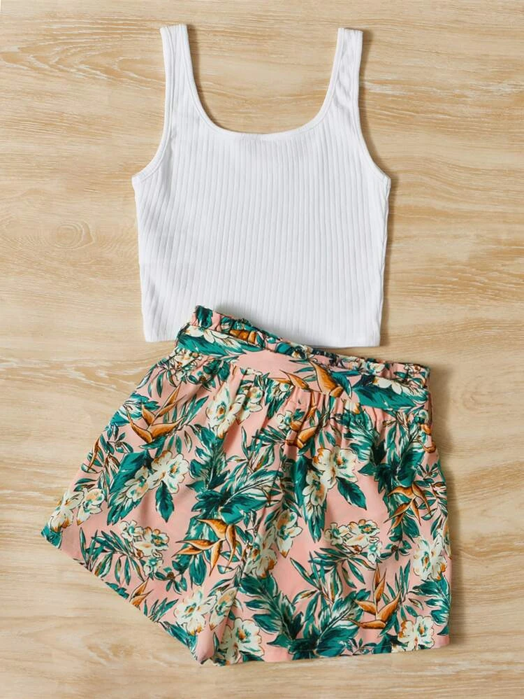 | nameOriginal | SHEIN Teen Girls Rib Knit Tank Top & Tropical Print Shorts Set |