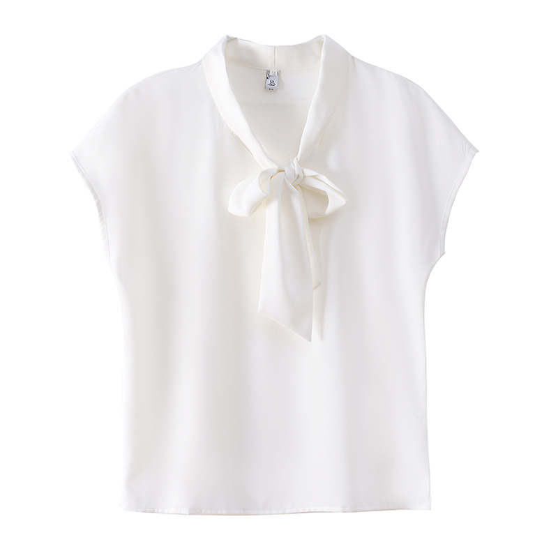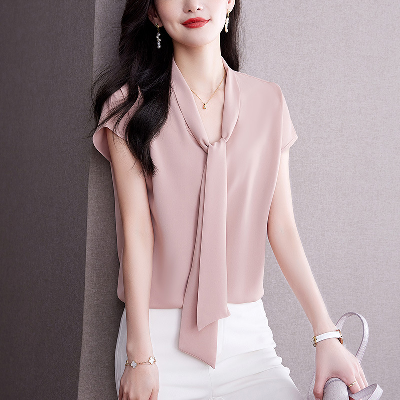 Ribbon Bow Shirt Women's 2024 Summer New Short-sleeved Professional Work Shirt Klein Blue Chiffon Top