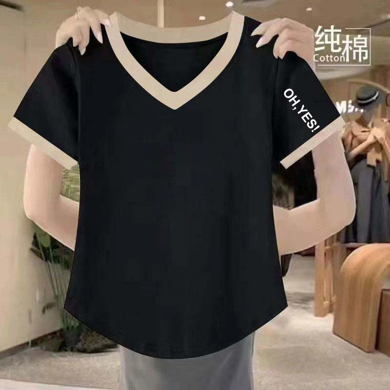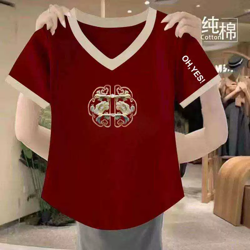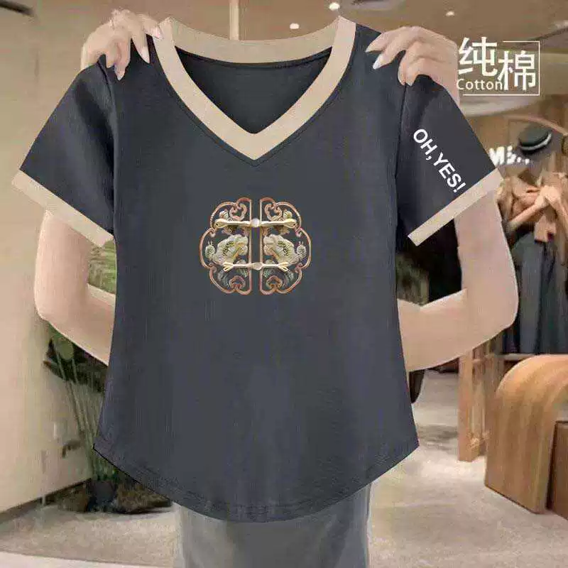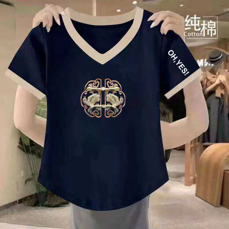 Right shoulder Chinese style pure cotton v-neck slim crop top T-shirt