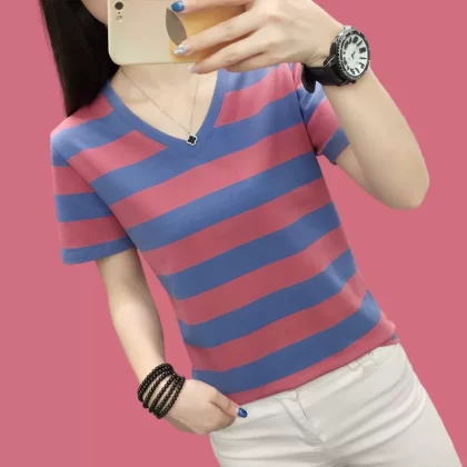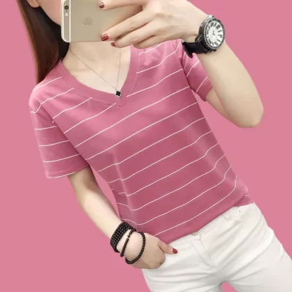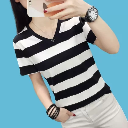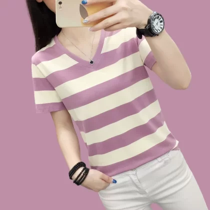 Front shoulder loose pure cotton high-end striped half-sleeved summer outfit