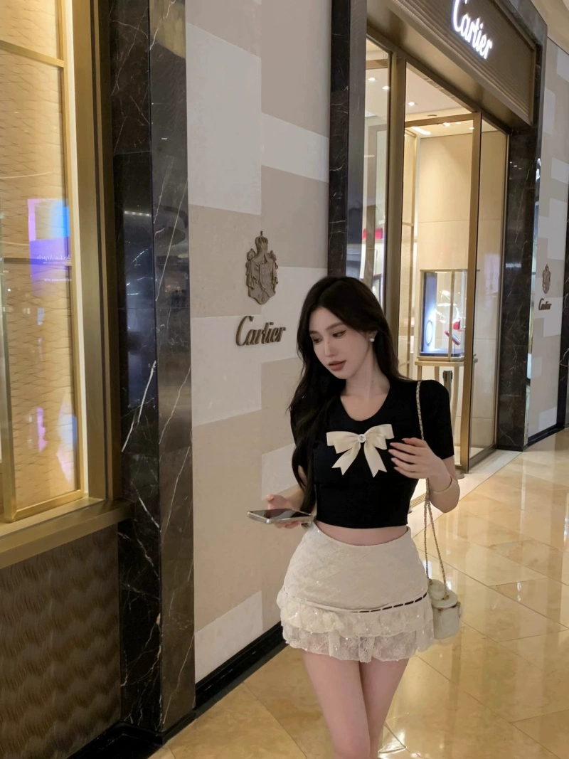 Right shoulder short sleeve summer sweet girl three-dimensional bow