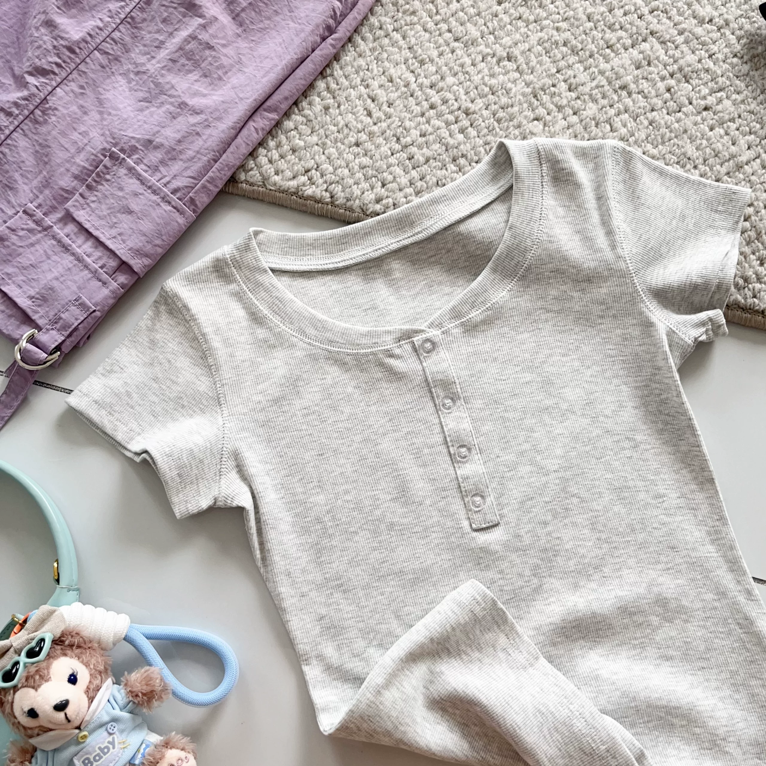 | nameOriginal | Right shoulder slimming button short-sleeved T-shirt with ribbed design |