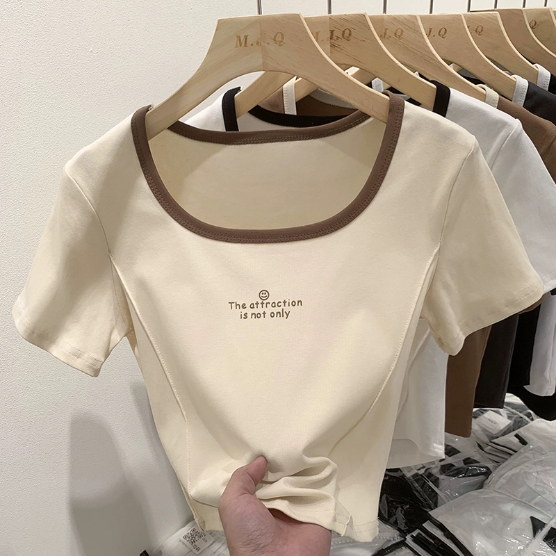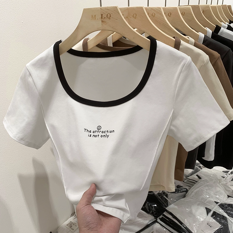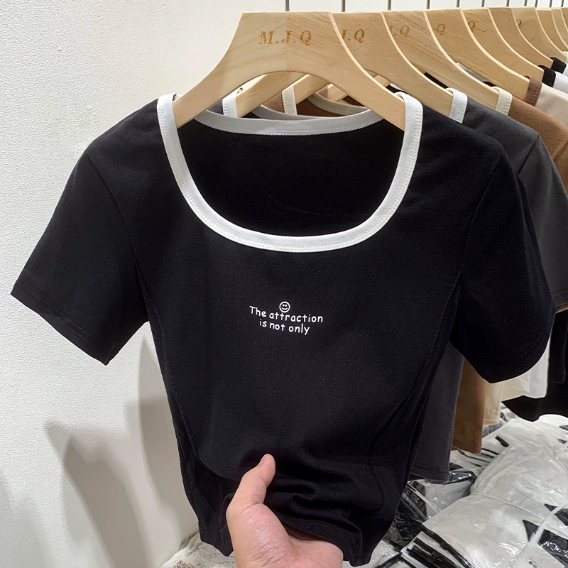| nameOriginal | Right shoulder, square neck, short-sleeved T-shirt for women in summer, ins color matching, pure lust hot girl slim fit, clavicle short fishbone top |