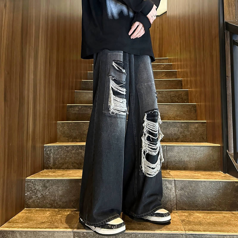 Ripped floor-length raw edge autumn high-waisted draped jeans