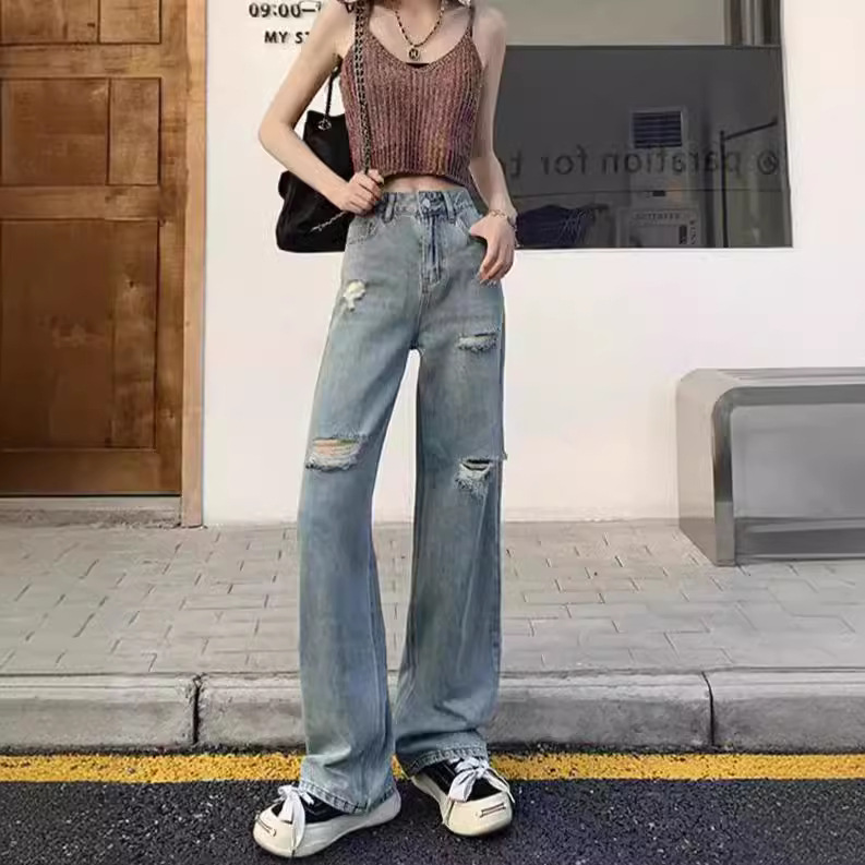 Ripped Jeans Women’s Summer New Design Sense Niche High Waist Loose Retro Slimming Dad Straight Wide Leg Pants