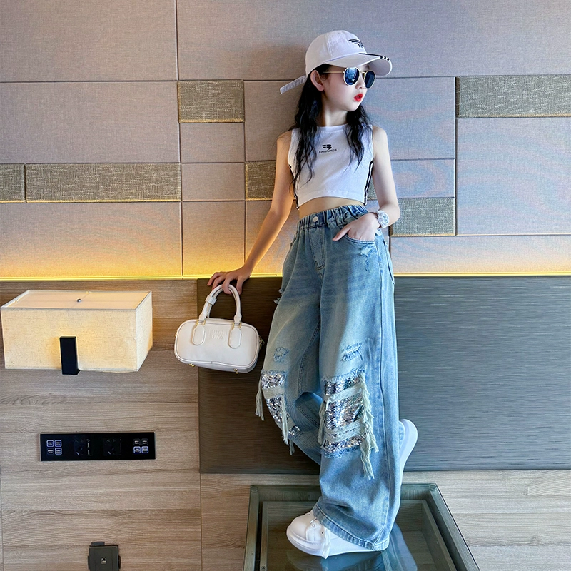 Ripped Straight Thin Girls and Big Kids Summer Jeans
