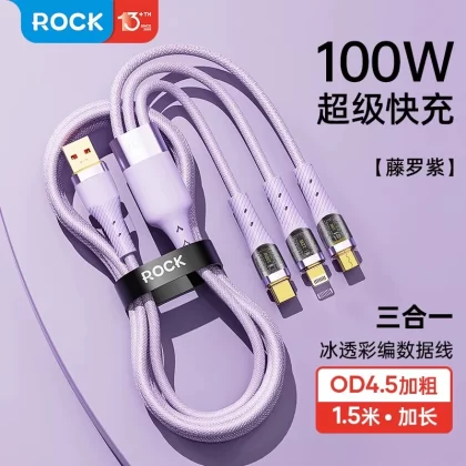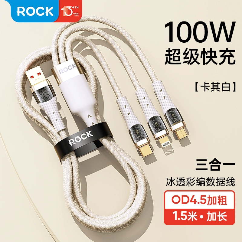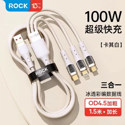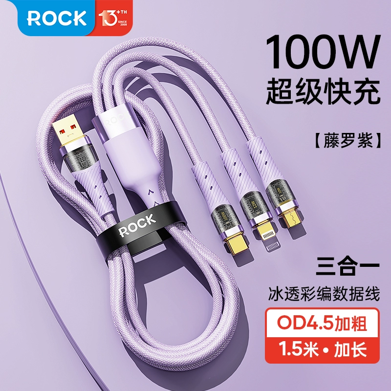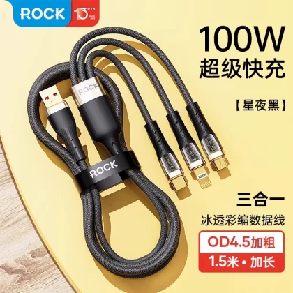 ROCK three-in-one data cable 100w super fast charging charging cable 6A mobile phone suitable for Apple 16 Huawei typec Android multi-function one-to-three car extended 66W two-in-one universal cable