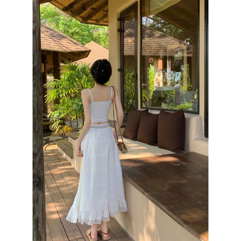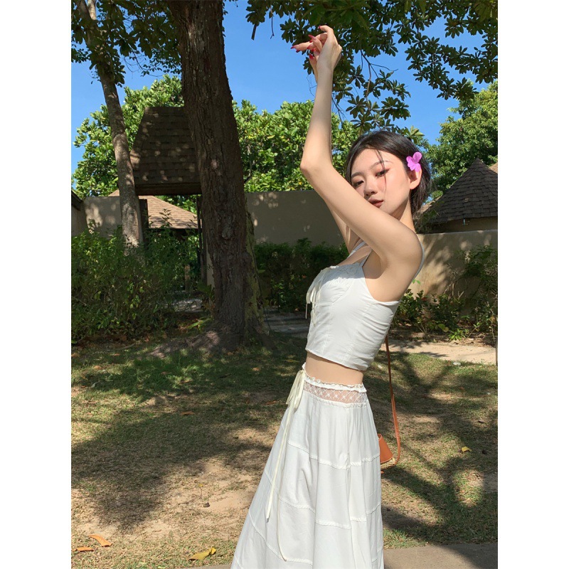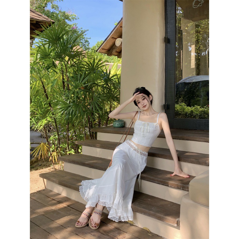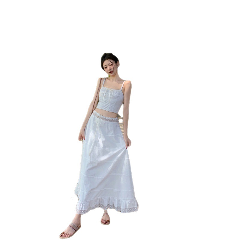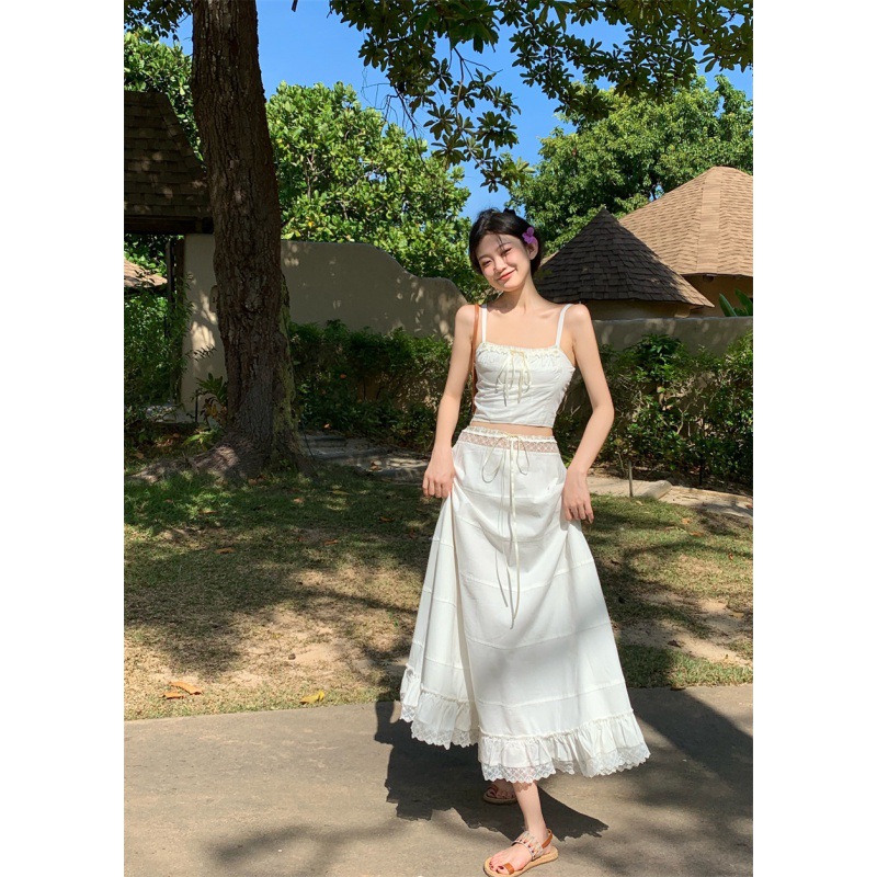 | nameOriginal | Romantic Summer Chic Niche Square Collar Strap Top Women's High Waist Slimming Long Dress Stitching Lace Suit Women |