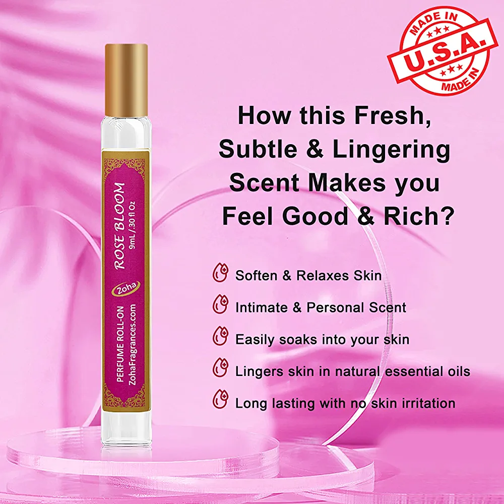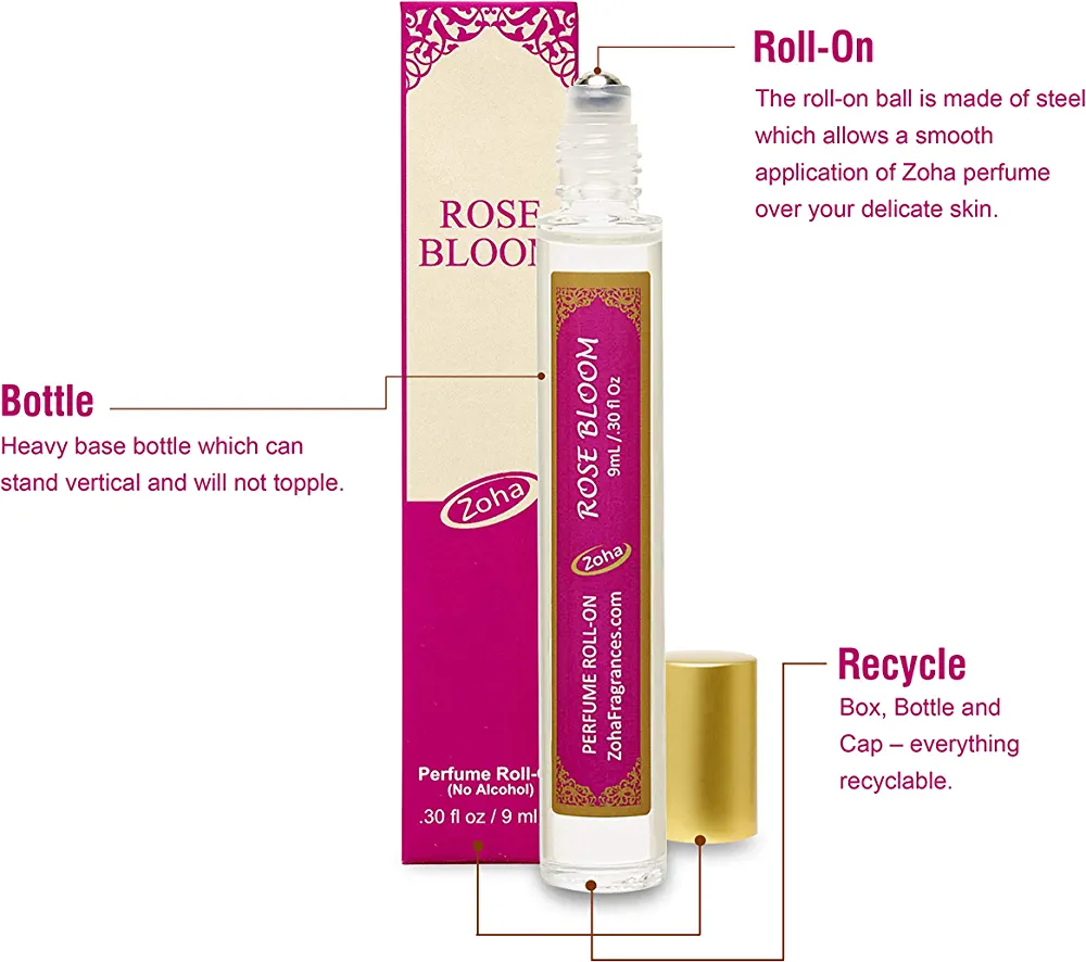| nameOriginal | Zoha Rose Bloom Perfume for Women and Men, Alcohol Free & Essential Oil Based Roll On Perfumes, Vegan & Long Lasting Perfume, Made in USA (9 ml/.30 Oz) |