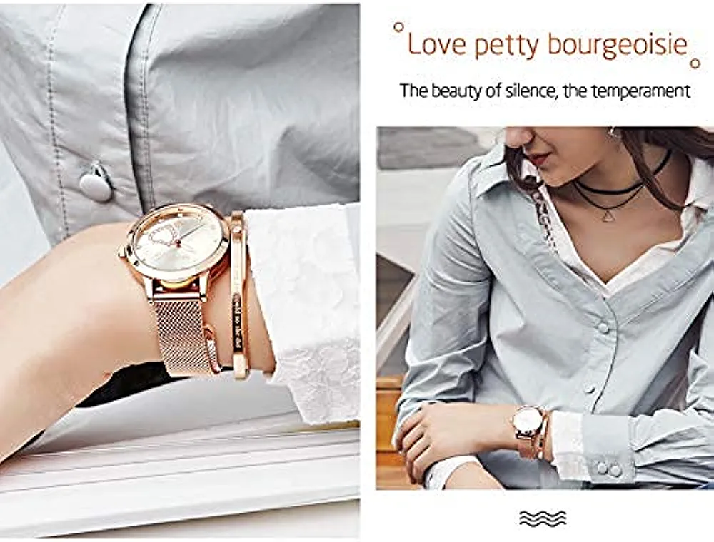 This Ladies Watch comes with a matching bracelet set that complements the watch perfectly. The set includes a beautiful rose gold stainless steel bracelet with diamond accents that adds a touch of sophistication to any outfit.