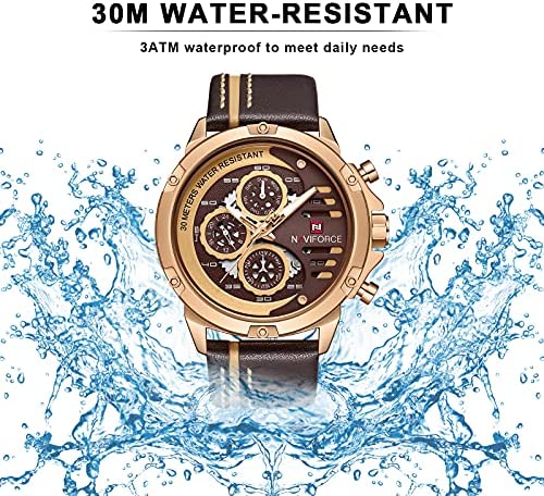 The NAVIFORCE Men Sport Watch is the perfect combination of style and functionality. With its waterproof design, this watch is perfect for any outdoor activity, whether it’s hiking, swimming, or just running errands in the rain. The military-inspired design gives it a rugged and durable look, while the rose gold accents add a touch of elegance and sophistication. The quartz movement ensures accurate timekeeping, while the leather strap provides comfort and durability. The watch also features a date calendar, making it easy to keep track of important dates and appointments. Whether you’re dressing up or dressing down, this watch is the perfect accessory to complete any outfit.