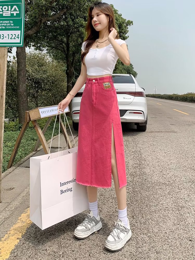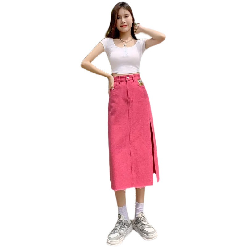 | nameOriginal | Rose Red Sweet Spicy Denim Skirt Women's Summer New Slim A- line Split Hip Skirt Large Size Mid-length Skirt |