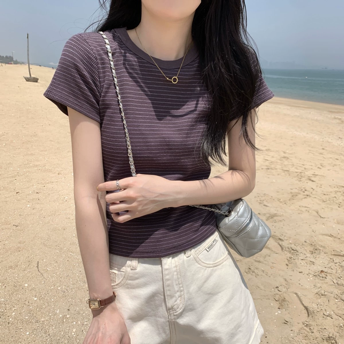 Round neck contrast striped summer slim short-sleeved T-shirt