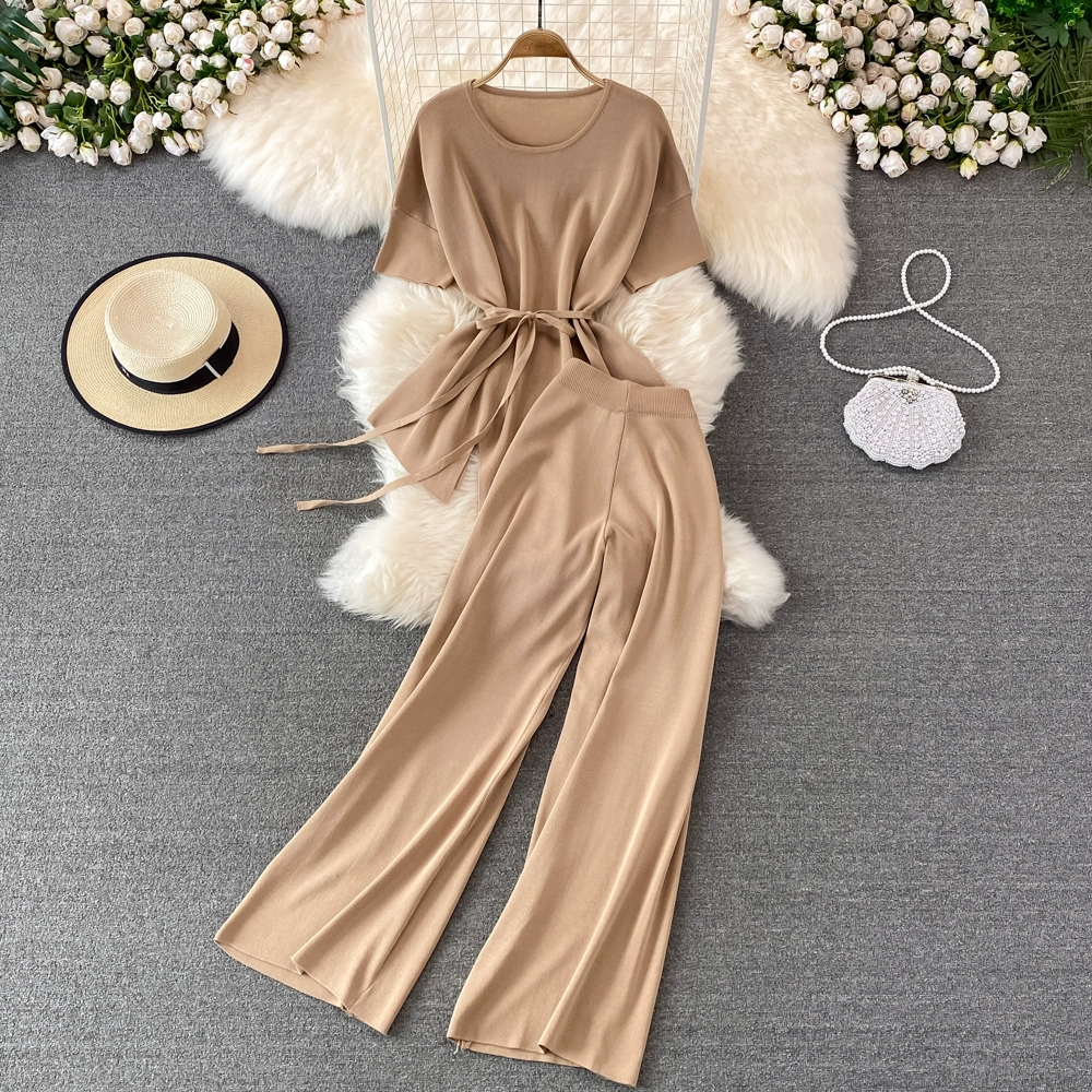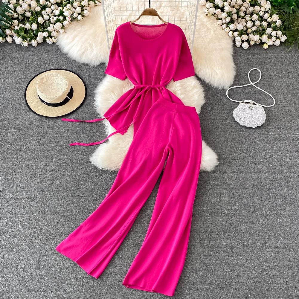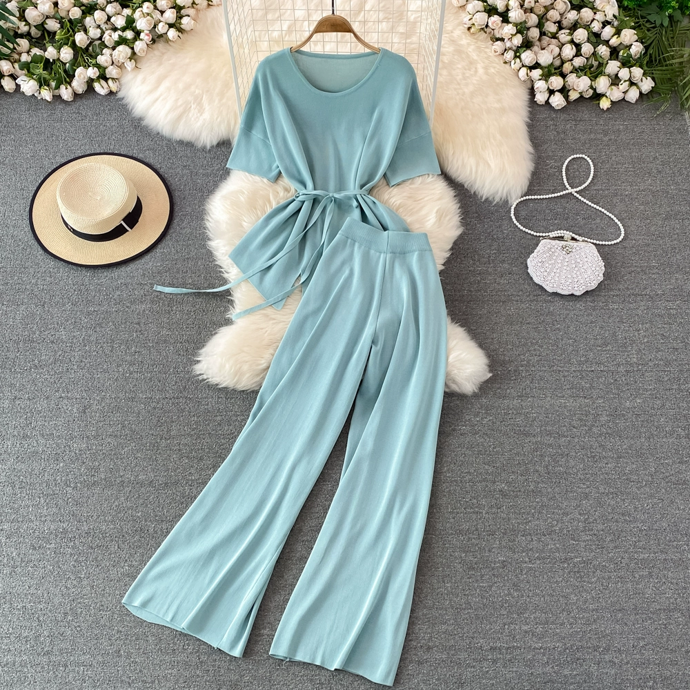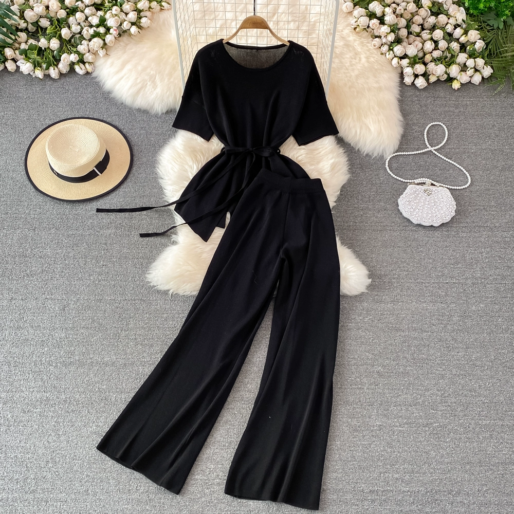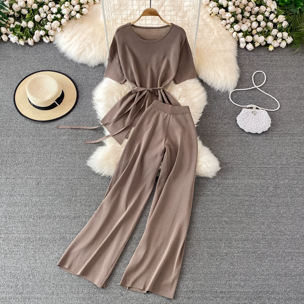 | nameOriginal | Round neck knitted top slimming wide leg pants fashion set |