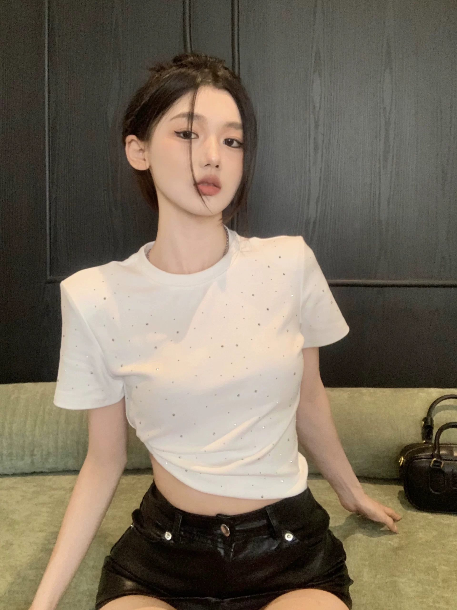 | nameOriginal | Round neck, short sleeves, right shoulder design, niche slim fit, hot rhinestones |