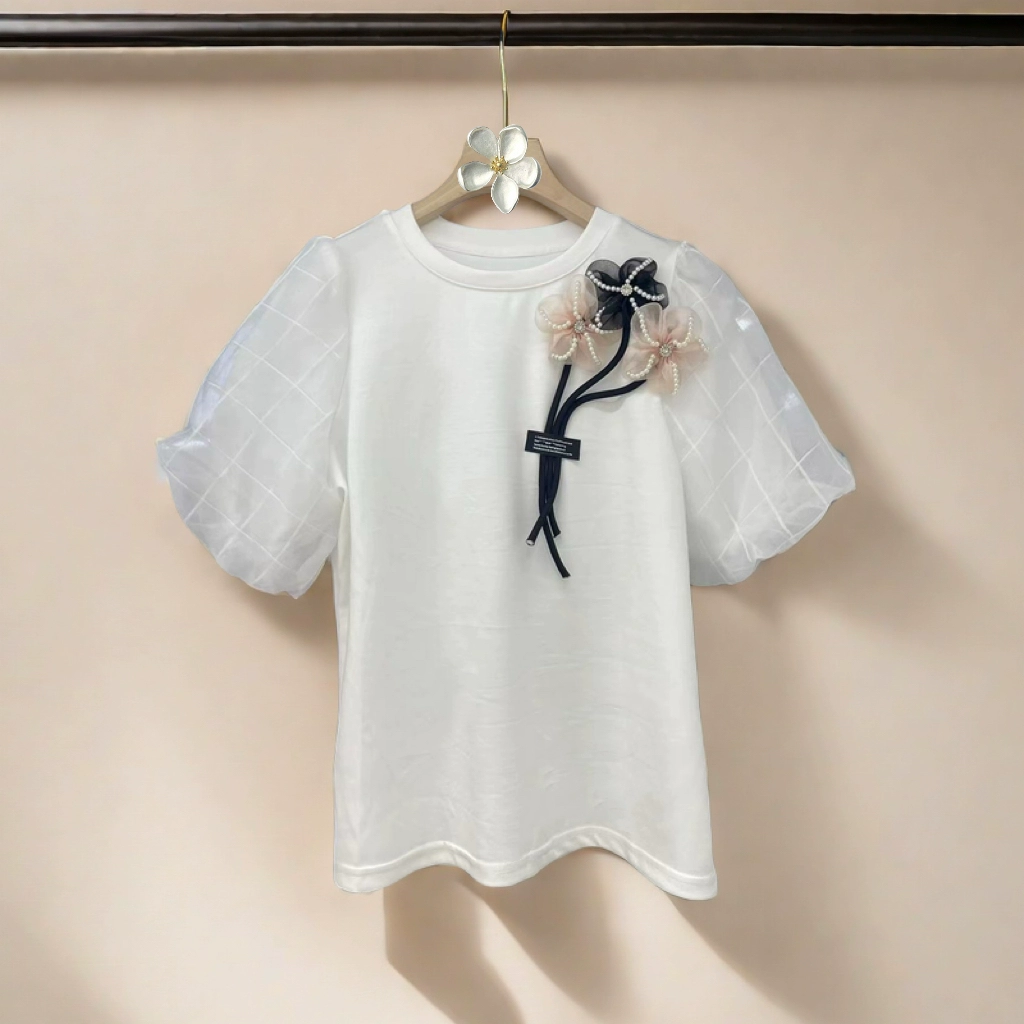 | nameOriginal | Round Neck T-shirt 2024 Summer New Design Three-dimensional Flower Chic Personalized Puff Sleeve Top Women's Casual and Versatile |