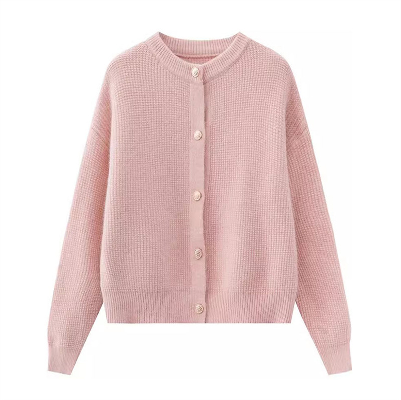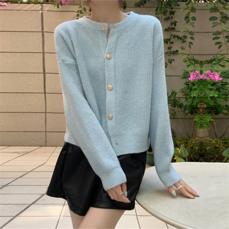 Round neck waffle Korean style small knitted cardigan Women’s Spring and Autumn New lazy sweater coat women’s top