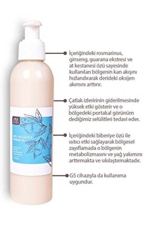 Ru cosmetic anti cellulite & firming gel exhibits highly stimulating, blood circulation enhancing and antioxidant activity on the skin. Cellulite & baking gel is a formula that helps eliminate the rough appearance and accelerates fat burning. Thanks to the extract of rosmarinus, ginseng, guarana and horse chestnut extract, it increases the oxygen flow to the skin by accelerating the blood flow of the area used in this way, it has a high effect in removing stretch marks and also retains cellulite in that area, which we call orange appearance. It plays an important role in increasing and tightening metabolism and fat burning of that region in regional slimming by providing a warming effect with rosemary plant extract in its content. Also suitable for use with the G5 device.