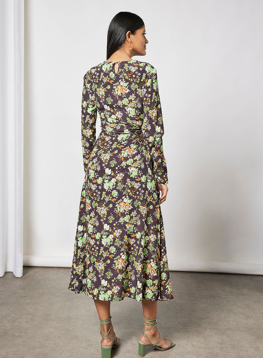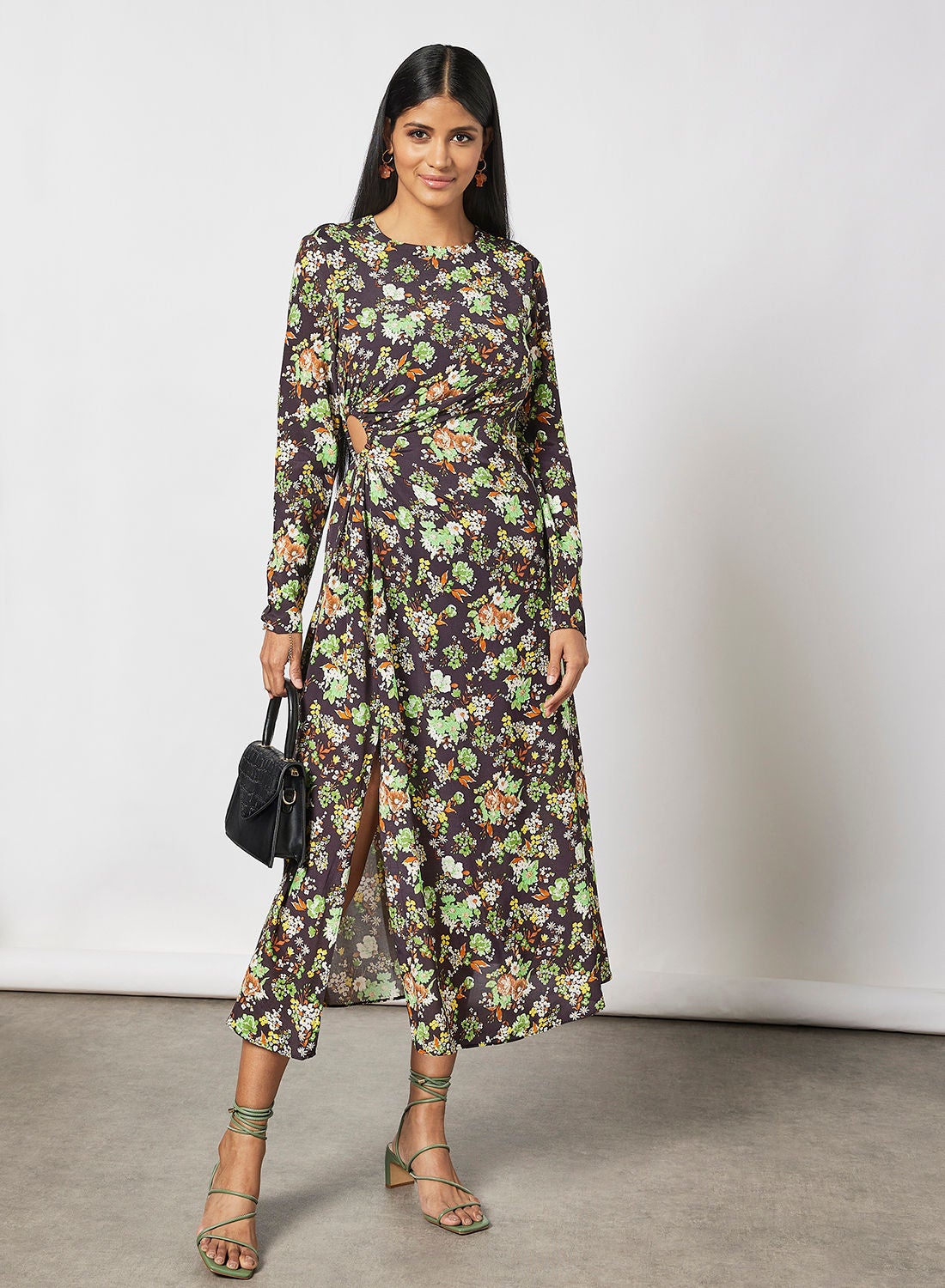 This product features a cozy and gentle viscose material with a charming floral pattern throughout. It has a round neckline and long sleeves, as well as a cut-out design on the side with ruched detailing. The thigh-high slit allows for easy movement, while the keyhole back has a button fastening. To maintain its quality, please follow the care label instructions when washing. The model is approximately 175cm tall and is wearing a size S.