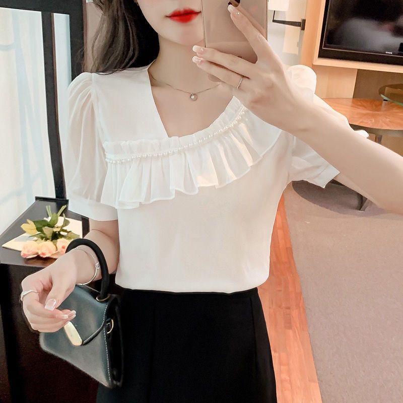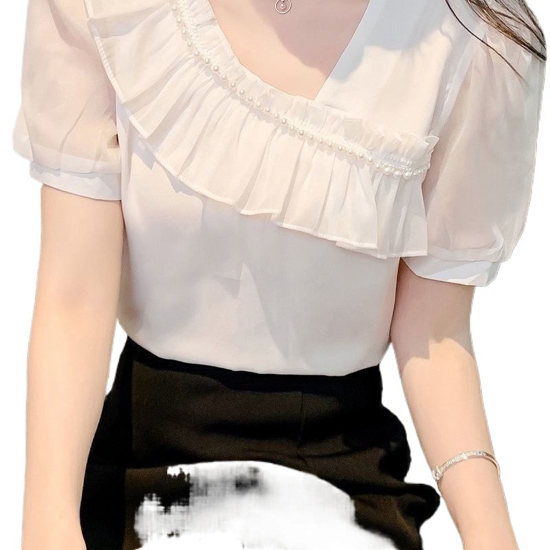 Ruffled Stitching Short-sleeved Shirt Women's 2024 Summer New Fashion Design Sense Niche Oblique Collar Super Fairy Top Women